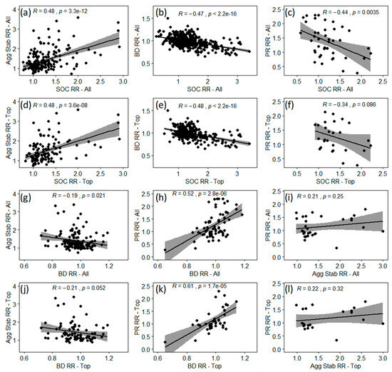 Pearson correlation tests were performed between all soil physical indicators RR, considering the results from all soil depths and separately only for the topsoil layer. For these analyses, we included the soil organic C response ratio even though it was not included in the meta-analysis because it is being considered in an analysis of soil biological health indicators.