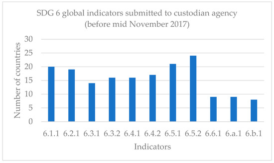The sustainable development goals (SDGs) are among the most ambitious UN targets and indicators to be established in recent decades and are detailed in Agenda 2030 [1]. For SDG 6, targets are [2] (pp. 10–11) “6.1 By 2030, achieve universal and equitable access to safe and affordable drinking water for all; 6.2 By 2030, achieve access to adequate and equitable sanitation and hygiene for all and end open defecation, paying special attention to the needs of women and girls and those in vulnerable situations; 6.3 By 2030, improve water quality by reducing pollution, eliminating dumping and minimizing release of hazardous chemicals and materials, halving the proportion of untreated wastewater and substantially increasing recycling and safe reuse globally; 6.4 By 2030, substantially increase water-use efficiency across all sectors and ensure sustainable withdrawals and supply of freshwater to address water scarcity and substantially reduce the number of people suffering from water scarcity; 6.5 By 2030, implement integrated water resources management at all levels, including through transboundary cooperation as appropriate; 6.6 By 2020, protect and restore water-related ecosystems, including mountains, forests, wetlands, rivers, aquifers and lakes; 6.a By 2030, expand international cooperation and capacity-building support to developing countries in water- and sanitation-related activities and programs, including water harvesting, desalination, water efficiency, wastewater treatment, recycling and reuse technologies; 6.b Support and strengthen the participation of local communities in improving water and sanitation management.” Indicators related to these targets are not always been monitoring (Figure 1).