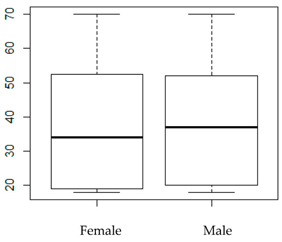 Gender and age of survey respondents. The box shows all the case rank, and the stress line is the median of age.