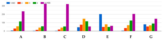 Google graphs on replies using the Likert scale about agreement or disagreement on every item (1 = No, I completely disagree –blue-, 2 = I partly disagree –red-; 3 = I am not sure –orange-; 4 = I partly agree –green-; 5 = Yes, I fully agree –purple-). Items used: A, I am aware about water use efficiency; B, I think climate change may affect water use; C, I am aware that drinking water is a scarce good; D, I believe that the water in my place of residence is well managed; E, I am aware of SDG 6: “ensure availability and sustainable management of water and sanitation for all”; F, The water facility that supplies my home is acceptable; G, I have received and read information about efficient water use.