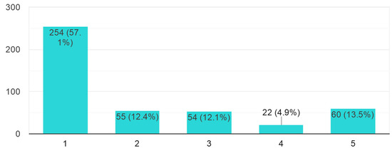 Regarding whether the respondents encountered any problem with the water, such as a bad taste or a particular disease, such as Helicobacter pylori, the majority state that they have not encountered such, as seen in Figure 5. While more than half responded ‘No’ to this question, 40.4% state that they have had some problem with the water, on a range of 2–4. Helicobacter pylori infects approximately 50% of the Spanish population [31,32].