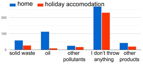 Answer to the question, “Do you flush solid waste, oil, other pollutants or other products down the drains (sink, WC, etc.) of your home or holiday accommodation, such as hotels or residences?” Number of people who do so at dwelling (blue) or in holidays (red).