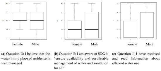 Women believe more strongly than men that climate change may affect water use, so the average of both varies, but not the median. Women also feel that water in their residential location is well managed or at least have a more positive and united view of it compared to men (Figure 8a). The fact that there are three items in quantitative terms (a,b,c) makes one think about the need to better educate the population, especially women, in relation to the SDG if better knowledge and active collaboration toward the Goal is to be achieved. Spain is a country with a Human Development Index (HDI) that, in 2019, was 25th in the world and ranks 20th in terms of gender equality [15] but also requires active participation to improve the efficient use of water.
