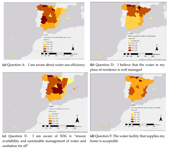 Spain does not have an equal distribution of water, as noted above, and this is reflected, for example, in its price, which in areas of great abundance is symbolic, while in others, like Murcia, it is more expensive than in all the ACs except Catalonia (Figure 9). This is because of the unequal distribution of rainfall across the territory and its use for differing requirements. Furthermore, according to data from the INE, the unit cost of water in Spain in m3/Euros has tripled since the year 2000. However, the perceptions of water “I believe that the water in my place of residence is well managed” (Figure 10c) and “The water facility that supplies my home is acceptable” (Figure 10d) does not fits with the real price of water (Figure 9).