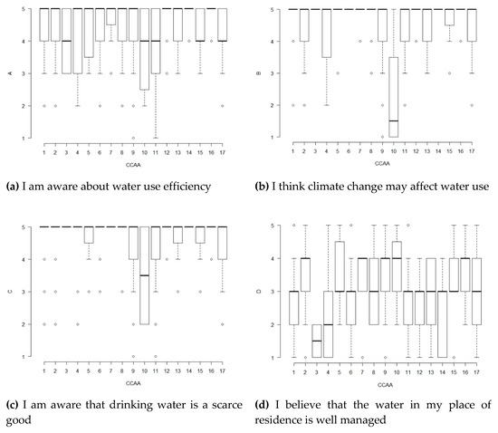 The awareness that drinking water is a scarce good (Figure 11c) is shown as an ‘agreed statement’, with the exceptions of the Community of Madrid, Navarre, Valencia, and Murcia, which also have an average slightly below the national average (4.55), indicating that some of their inhabitants do not perceive water to be a scarce good. This is understandable in Madrid and Navarre, but in Valencia and Murcia, the explanation can be found in the large number of non-university respondents, as it is known that this group has a lower level of awareness of these problems.