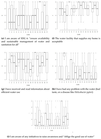 The generalized lack of knowledge of SDG 6: ‘ensure availability and sustainable management of water and sanitation for all (Figure 11e) stands out, with an average of 2.37 and a median of 2 (the third worst valued item) for the total of those surveyed. This fact is especially notable in the Canary Islands, Catalonia, the Community of Madrid, Navarre, the Basque Country, and Murcia, with an average below the national average. Many of these communities are among the most industrialized in the country. It would be necessary to study in greater depth the training in sustainability offered in schools and the fact that the SDG period begins in 2015 (2015–2030 period) and most people have not heard of it, as before those years, there was no education for sustainability as we now understand it. There is a great dispersion in the responses in several Communities (Castile-La Mancha and the Principality of Asturias, with responses in the range of 5 on the Likert scale, and 4.5 in Aragon and Castile and León).