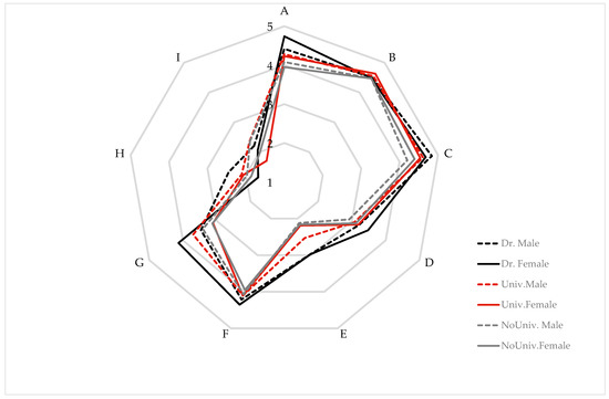 Spider diagram of the population’s perception of water problems and management by educational level and gender using the items in the survey. Note: A=I am aware about water use efficiency; B=I think climate change may affect water use; C=I am aware that drinking water is a scarce good; D= I believe that the water in my place of residence is well managed; E=I am aware of SDG 6: “ensure availability and sustainable management of water and sanitation for all”; F=The water facility that supplies my home is acceptable; G=I have received and read information about efficient water use; H = I have had any problem with the water (bad taste, or a disease like Helicobacter pylori...); I = I am aware of any initiatives to raise awareness and “oblige the good use of water”.