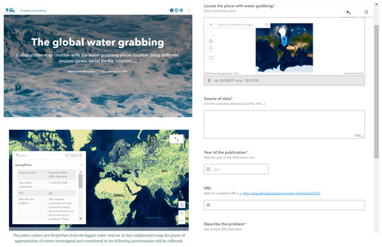 Global water grabbing story map explaining how the appropriation of water works in some places of the world. M.L. Lázaro own work using ArcGIS Online, Survey123, and Story Map (ESRI).