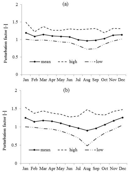 Under future climate change scenarios, both the magnitude and frequency of the precipitation would change. The perturbation factor is the changes of precipitation or temperature time series between the future and control period. For temperature, the perturbation factors defined as absolute differences between future and control periods; for precipitation, they are defined as relative changes (ratios of the values during future versus control periods). Figure 5 shows the mean monthly frequency changes determined by the GCMs for different RCPs. The results indicate that, under the mean level, the variation of rainy days in each month is the largest under the RCP2.6 scenario, ranging from −8% to 6%; and the most moderate under RCP 6.0 scenario, ranging from −1% to 2%. Under the RCP4.5 and RCP8.5 scenarios, the change of rainfall days was found similar. The number of rainy days would increase under RCP4.5 and RCP8.5 from September to the following January, and also would increase from March to June; in February, July, and August, the number of rainy days would exhibit a moderate declining of approximately 3%. Under the low and high levels, the changes of rainy day numbers would be from −20% to −3% and 6 to 22%, respectively.
