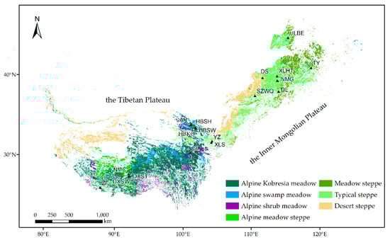 Northern China’s grasslands are mainly composed of alpine and temperate grasslands, which are widely distributed in the Tibetan Plateau (TP) and Inner Mongolian Plateau (IM), respectively (Figure 1). The TP and IM have distinct environmental features [13]. The TP is in the alpine climate zone, and the average elevation of TP is over 4000 m. The range of mean annual precipitation is from 200 to 600 mm, and the range of mean annual temperature is from −5.75 to 2.57 °C. The alpine grasslands represent a typical ecosystem in the central Asia alpine environment and cover more than 60% of the plateau [15]. The IM is under arid and semi-arid conditions, with an average elevation of approximately 1000 m. The range of mean annual precipitation is from 200 to 350 mm, and the range of mean annual temperature is from 3 to 6 °C. The temperate grasslands growing on the IM are an important component of the Eurasian grasslands, and represent a typical vegetation type under the temperate continental climate [16].