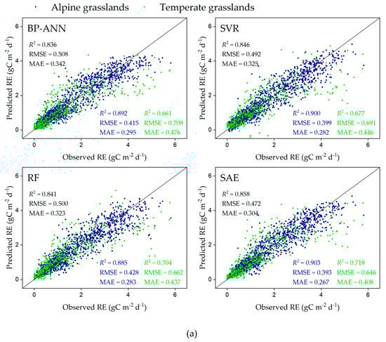 We first trained the BP–ANN, SVR, RF, and SAE models for all of northern China’s grasslands. The predicted RE from the four models agreed well with the observed RE and occurred at approximately the 1:1 line, indicating that all four ML models estimated RE in the grasslands of northern China fairly well (Figure 2a). However, there were still appreciable differences in the performances among the four models. The SAE model produced the lowest RMSE (0.472 gC m−2 d−1) and MAE (0.304 gC m−2 d−1) and the highest R2 (0.858), demonstrating that of the four models, SAE performed best in estimating RE. The SVR prediction performed the second-best with higher RMSE (0.492 gC m−2 d−1) and MAE (0.325 gC m−2 d−1) and lower R2 (0.846) than those of SAE. RF had slightly higher RMSE (0.500 gC m−2 d−1) and lower R2 (0.841) than those of SVR, but had slightly lower MAE (0.323 gC m−2 d−1) than that of SVR. BP-ANN produced the highest RMSE (0.508 gC m−2 d−1) and MAE (0.342 gC m−2 d−1) and the lowest R2 (0.836).