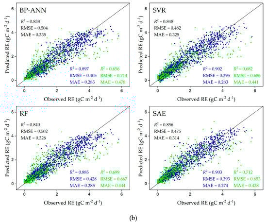 In recent years, several ML models have been widely used to estimate RE at regional and global scales [8,9,30,62]. However, few studies have systematically evaluated and compared the performance of different ML models in estimating RE. In this study, we evaluated and compared the performance of three traditional ML models (BP–ANN, SVR, and RF) and a DL model (SAE) for estimating RE in the grasslands of northern China. We found that all four models could estimate RE fairly well in the study area (Figure 2). This can be explained by the fact that RE has strong dependencies on the selected environmental variables in the grasslands of northern China, and all four ML models have sufficient capabilities to learn these underlying dependencies to estimate RE, although they have different learning principles (introduced in Section 2.2.2). However, REs predicted from ML models were underestimated while the RE was getting larger (Figure 2). This may be caused by two reasons. First, we estimated RE for each 8-day interval. The 8-day Ta, LSWI, PAR, NDVI and EVI values may not represent some weather events influencing RE during that period [45,65], such as extreme heat and precipitation in summer. Second, some large RE values may be caused by certain atmospheric turbulent events rather than real ecological processes [66]. ML models are well known for having the ability to automatically learn complex nonlinear relationships from input data [49,67]. Given that RE is difficult to constrain due to our limited understanding of the complex interactions among physical, chemical, and biological processes [5,14], ML models can help us accurately quantify the spatiotemporal variation in RE at regional or global scales.