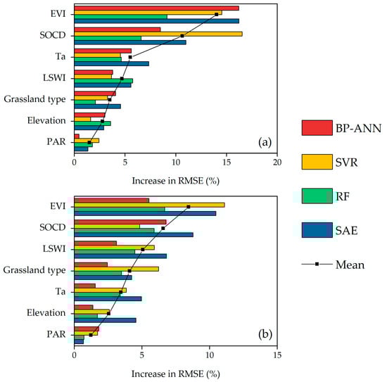 Relative importance of the environmental variables in predicting RE (a) in the alpine grasslands and (b) in the temperate grasslands. List of acronyms: back propagation artificial neural network (BP–ANN), support vector regression (SVR), random forests (RF), stacked autoencoders (SAE), enhanced vegetation index (EVI), soil organic carbon density (SOCD), land surface water index (LSWI), air temperature (Ta), photosynthetically active radiation (PAR), root mean squared error (RMSE).