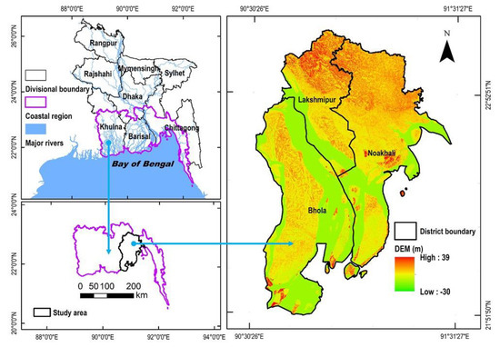 The study area covers the Lower Meghna River Estuary (LMRE) situated in the central coastal zone of Bangladesh between 21°54′ N–23°10′ N latitudes and 90°01′ E–91°27′ E longitudes with a total area of approximately 7880 km2 (Figure 1). Administratively, the study area has three districts: Noakhali, Lakshmipur, and Bhola; 21 sub-districts, 14 municipalities, and 203 communities, with a total population of 7.42 million [26]. It shares a border with Comilla and Chandpur in the north, Barisal and Patuakhali in the west, the Bay of Bengal in the south, and Feni and Chittagong in the east. The Meghna River estuary is one of the widest (2.5–22.4 km) estuarine rivers in the world. The LMRE has 22,156 km2 of the coastal land surface where semidiurnal tide directly controls streams and estuarine flows [27]. The region has a yearly average temperature of 26.2 °C, and the yearly average precipitation is 2100-3500 mm [26]. The lower Meghna River carries a combined flow of water, typically at 120,000 m3/s, which causes a high level of hydro-dynamic activity and leads to a high rate of erosion and sediment deposition [27]. The average elevation of the study area is approximately 5 m above sea level (Figure 1).