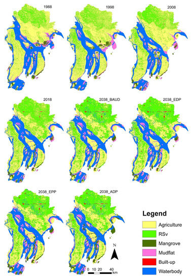 Scenario 3: Ecological protection priority (EPP) scenario. Taking into account the BAUD scenario, but restricted the artificial land conversion from mangrove forests and mudflats, the extent of change in various other LULC types continue to fluctuate. This scenario needs to intensify agricultural activity through the use of improved inputs, such as seeds, fertilizer, and proper irrigation, superior residue management, and increased cropping intensity through the adoption of new technology. Moreover, this scenario requires more compact and vertical settlements to accommodate the increased population.