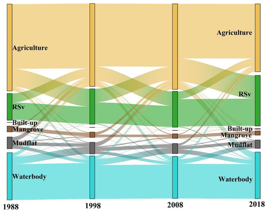 Among the different LULC types, the RSv and built-up areas exhibited rising trends from 1988 to 2018. Precisely, the largest increase of a single LULC was evident for RSv (1050 km2), while the growth of RSv from 2008 to 2018 was higher than that of the previous two-time intervals, such as 1988 to 1998, and 1998 to 2008. Although the proportion of the built-up area is very small, it has increased tremendously (almost ten times) during 1988 (2.247 km2) to 2018 (23.73 km2). However, the proportions of the remaining four LULC types declined with fluctuations. Unlike the RSv, the area of agricultural land has decreased by 777 km2 from 2008 to 2018, significantly more faster than that (61 km2) from 1988 to 2008. Both the mangrove forest and mudflat land have declined by 65 km2 and 147 km2, respectively, during 1988-2018, with a significant decrease between 1998 and 2008 (32 km2 and 70 km2, respectively). The area of water body decreased by 21 km2 during 1988 to 2018, with a preliminary rapid decline accompanied by a slightly less decline in the middle and a sharp increase at the end (Figure 3 and Figure 4).
