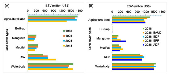 The total ESV of the LMRE decreased by as much as US$105.34 million during 1988-2018, of which 66% is attributable to agricultural land loss while 13%, 17%, and 3% are from the losses of mangrove forests, mudflats, and water bodies, respectively. The predicted ESV results indicated that if the LULC change pattern in 2038 continues following the BAUD and EDP scenarios, the total ESV will decline by US$41.37 and US$16.38 million, respectively, while under the EPP and ADP scenarios, total ESV will increase by US$60.61 and US$130.95 million, respectively.