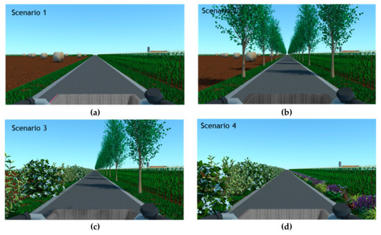 To accomplish the study aim, a driving simulator (a technique used to assess car drivers’ behaviour, usually combined with qualitative and/or qualitative measures [24,25]) was used to encompass cyclists’ experience of virtual greenways. To this end, four virtual runs simulating bikers moving along a rural greenway at 25 km/h were created to find out first, what kind of planting combination along a rural greenway is the most preferred, and second, which planting combination is perceived as the most restorative by bicycle riders. To investigate preference and perceived restoration, virtual cyclists were administered questionnaires to assess qualitative measures. It is hypothesized that planting solutions characterized by greater variety and aesthetic flow would be more preferred and restorative.