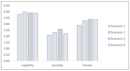 As far as the first component is concerned, there are no significant differences among scenarios, which all scored high on attributes loading on legibility (see Figure 2); regarding sociality, where scores are average, scenario 3 turned out to be the most suitable as a place for meeting and leisure activities. Finally, the variety component shows significant differences between scenario 1 (control condition, no designed planting) and the other scenarios.