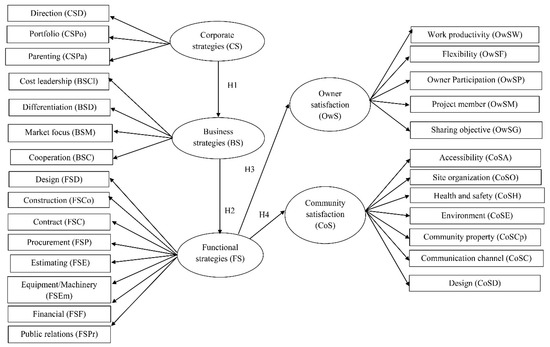 Although strategy formulation markedly affects the success of changes in contractor organizations in reaching the desired future positions, and fulfills owner and community satisfaction via sustainable production processes, the definitions of strategy vary. As an early leader in the discussion, Porter [9] described the competitive strategy as the selection of actions leading to firm competitiveness in an industry or market. Salimian et al. [10] defined strategies as decisions on the future positions of organizations and the ways by which to arrive at these positions. Ho [11] saw strategy as incorporating all of an organization’s actions from various functional units. Based on a resource-based approach, Johnson and Scholes [12] explained strategy as an organization’s selection for performing activities that correspond with its environment and available resources. Salimian et al. [10] also indicated that strategy was defined at the corporate (top), business (middle), and functional (bottom) levels, with the success of the organization depending on not only formulating strategies at these levels but also aligning the strategies. To integrate the various definitions presented by previous researchers, strategy here means decision making about focusing or spending resources on selected activities, after analyzing the internal and external environment, to achieve the organization’s objectives and desired future position. How an organization spends its resources can be reflected by multilevel strategies at the corporate, business, and functional levels. As such, the following will review corporate, business, and functional strategies recommended by previous studies. Then, either owner and community satisfaction indicators, or the relationship between the contractor strategies and owner/community satisfaction, will be reviewed to establish research hypotheses.