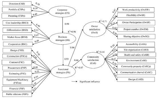 The relationship between multilevel strategies and satisfaction (Figure 2) is consistent with Haverila and Fehr [41], who defined satisfaction as a perception of qualities matching preconceived expectations, whereas bottom-level management mainly develops functional strategies to improve construction quality. Therefore, only the functional level of strategies directly influences both CoS (DI = 0.66) and OwS (DI = 0.84). Additionally, the squared multiple correlations (R2) of OwS and CoS were 0.71 and 0.44, indicating that the functional levels of strategies influence 71% and 44% of the variances in the owner and community satisfaction, respectively, which provides evidence to support the results to a certain level.