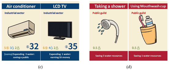Figure 1. In Water Ark, participants can choose the organization that they wish to play as. The table in picture (a) is used to present the information on water prices and the tax rate made by GM. GM, government; AS, agricultural sector; IS, industrial sector; PG, public guild; The cards in picture (b) are food produced by AS; the cards in picture (c) are equipment produced by IS; and the cards in picture (d) are water-saving methods done by PG. The information at the bottom left is the cost of the card, the value at bottom right is the selling price, and the sentence at the bottom is the function of the card in the game. - 2.