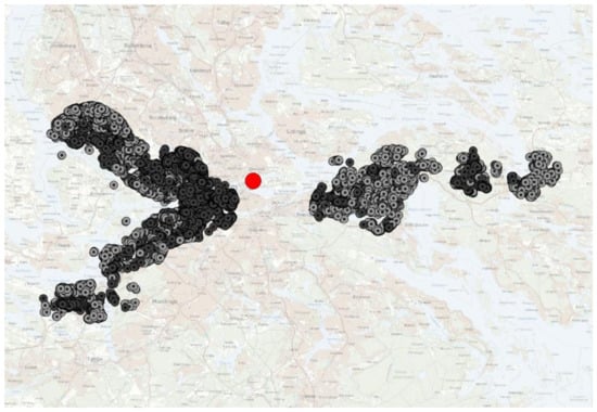 In total, 22,660 apartments are included in the sample; a vast majority of these, 18,359 is located along with the subway stations, while 4301 are located along with the bus stations described in Figure 1. Light grey dots represent single-family homes, and the darker grey dots represent cooperative apartments. Stockholm central business district (CBD) is marked in the center or the map with a red dot.