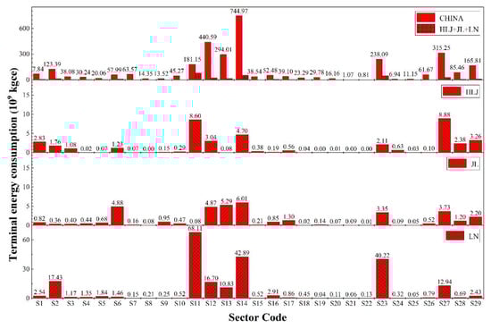 The total terminal energy consumption of China, HLJ, JL, and LN was 3220.66 million tons of coal equivalent (Mtce), 42.50 Mtec, 39.32 Mtec, and 222.67 Mtec, respectively, in 2012. The terminal energy consumption of HLJ, JL, and LN accounted for 1.32%, 1.22%, and 6.91% of that of China, respectively (Figure 2). From the sectoral perspective, smelting and calendaring of metals (S14) contributed the most to energy consumption in China, accounting for 23.13%, followed by manufacture of chemical products (S12) and transport, storage, and post (S27). However, the distribution characteristics of sectoral energy consumption of the three regions were different from that of China. The top three energy consumers were S14, petroleum processing and coking (S11), and S27 in HLJ (accounting for 52.18% of total energy consumption), S14, manufacture of non-metallic mineral products (S13), and manufacture of food and tobacco (S6) in JL (accounting for 41.14%), and S11, S14, and production and supply of heat and electricity (S23) in LN (accounting for 66.34%). The total energy consumption in LN was larger than the sum for HLJ and JL in 2012. Specifically, energy consumption of mining and washing of coal (S2), S11, S12, S13, S14, and S23 in LN was much larger than that of these sectors in HLJ and JL. According to the top panel in Figure 2, the sum of energy consumption of three regions in some sectors exceeded 1/10 of China’s corresponding sectors’, including high-energy-consumption sectors (mining and washing of coal (S2), manufacture of food and tobacco (S6), S11, and S23) and low-energy-consumption sectors (mining and processing of non-metal ores (S5), waste material (S21), repair services for metal products, machinery, and equipment (S22), and production and supply of gas (S24)). The above results show that the three heavy industrial regions were more energy-intensive, especially LN.