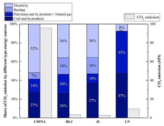 Regional and national total CO2 emissions and proportion contributed by different types of energy sources. Due to data unavailability on energy consumption for heating, the category structure of energy sources in Liaoning (LN) is different from that in Heilongjiang (HLJ), Jilin (JL), and China).