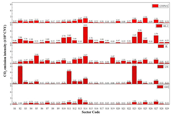 CO2 emission intensity is defined as the amount of CO2 emission of unit sectoral output. The sectoral CO2 emission intensities of three regions and China in 2012 are shown in Figure 4. In order to investigate the differences in CO2 emission intensity between heavy industrial and developed regions, we added Guangdong (GD) Province’s CO2 emission intensity into Figure 4. The CO2 emission intensities of HLJ, JL, LN, and GD were 1.85, 1.43, 2.00, and 0.68 times that of China, respectively. From the sectoral perspective, CO2 emission intensities of S2, S11, and S23 in LN, S5 and S19 in JL, and S11, S14, and S24 in LN were much larger than that of China and GD. However, it is unreasonable to restrict the production of some sectors with relatively higher CO2 emission intensity. This is because the sectors with high CO2 emission intensity are usually recognized as critical sectors which provide raw material and energy to downstream sectors or supply products to final consumption sectors. Therefore, it is necessary to explore methods to balance the economic growth and CO2 emission reduction.