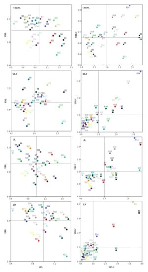 The main goal of this study is to reduce carbon emissions while not affecting the economic growth obviously. It is clear that allocating the CO2 emission reduction task by sector is unfair and unfeasible because all sectors are correlated in supply-and-demand relationships. Therefore, production limits should focus on industrial groups defined by linkage characteristics, rather than separate key emission sectors. Unified forward linkage of production (UFL), unified backward linkage of production (UBL), unified forward linkage of CO2 (UFLC) emissions, and unified backward linkage of CO2 (UBLC) emissions were quantified (see Equations (15)–(18)) to explore the effect of the unit change of one sector’s final demand or intermediate inputs on the entire economy and total CO2 emissions. All panels are organized showing unified backward linkages on the vertical axis and unified forward linkages on the horizontal axis in Figure 5. Comparing the left and right panels, it can be clearly revealed that a unified linkage concept from economy into CO2 emission terms increases the range of linkage values; this finding is consistent with Chang [27] and Lenzen [47]. The values of UFLC and UBLC (0.06–2.28 and 0.25–2.15 in China, 0.04–3.39 and 0.2–2.85 in HLJ, 0.06–2.49 and 0.32–2.36 in JL, and 0.03–4.76 and 0.17–4.13 in LN, respectively) distribute in a wider range than those of UFL and UBL (0.38–1.61 and 0.58–1.22 in China, 0.60–1.64 and 0.66–1.32 in HLJ, 0.44–1.66 and 0.75–1.23 in JL, and 0.43–1.45 and 0.56–1.19 in LN, respectively). From the perspective of the sectoral level, some specific sectors (i.e., S14 and S24 in HLJ, S14, S5, and S21 in JL, and S2 and S23 in LN) induce the wide distribution of linkage values in the three heavy industrial regions.