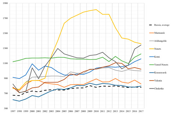While Schmale et al. [42], Law and Stohl [43], Shindell et al. [44], and Kuhnlein et al. [31], among others, conducted the estimates of Arctic-specific disease incidence through environmental and nutritional impacts, a question remains whether particular public health parameters might experience the effects of economic factors [45]. Chen and Kan [8] recognized the people with low socioeconomic status as high-risk subgroups in terms of proneness to respiratory, cardiovascular, and other health effects. During the times of economic and social transformations in Russia in the 1990–2000s, the environmental situation in the Arctic deteriorated substantially with by-all-means emergence of extractive industries. Larsen and Fondahl [46] expected that the industrialization and urbanization trends in the Arctic accelerate in the future. The emissions of air pollutants and wastewater discharge will increase and mostly be emitted around existing industrial sites and human settlements. Due to the environmental disruptions of traditional sources of food and water, circumpolar communities have become increasingly vulnerable to economic insecurity [47]. Morozova et al. [48], Erokhin [49], and Liefert and Liefert [50] reported degrading purchasing power of population in Russia, which resulted in the redistribution of family means in favor of food, as well as a shift to less expensive food products and more affordable sources of proteins of lower quality and nutrition value [51,52].