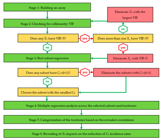 The study started with a selection of Xn regressors to be considered for inclusion in the model and development of the regression model (Stage 1). To avoid redundancy, variance inflationary factor (VIF) was computed for each Xn at Stage 2. Based on the criteria developed by Snee [57] and further applied by Kutner et al. [58], Montgomery et al. [59], and Ermakov et al. [60], that VIF values should be less than 5, those Xn for which VIF > 5 were excluded from the model. At Stage 3, a best-subsets regression was performed with the remaining Xn for all models. To finalize the collinearity test, the parameters of adjusted R2 [61,62] and Mallows’ Cp statistic [63,64,65,66] were computed for each subset. The subsets with Cp > (k + 1) were eliminated; the study proceeded with those “best” subsets for which relative Cp were the lowest and/or adjusted R2 were high. At Stage 4, multiple regression analysis of the models chosen was performed across Yn regressands and territories. The revealed correlations allowed us to categorize the territories based on several parameters (Stage 5) and discover the effects of Xn regressors on Yn regressands (Stage 6).