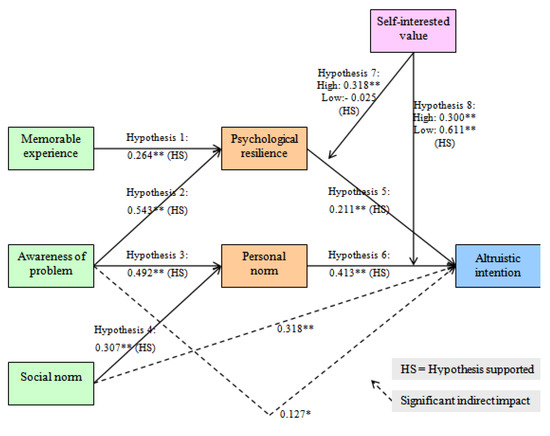 Our finding from the chi-square test showed that the linkage from psychological resilience to altruistic intention significantly differs between high and low groups of self-interested value (Δχ2 (1) = 9.344, p < 0.01). Therefore, hypothesis 7 was supported. Our result also showed that the relationship between personal norm and altruistic intention was significantly different between the two groups (Δχ2 (1) = 4.851, p < 0.05). Accordingly, hypothesis 8 was supported. Overall, our result demonstrated that self-interested value acted as an important moderating part within the projected conceptual framework.
