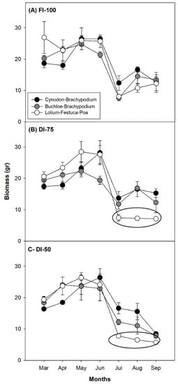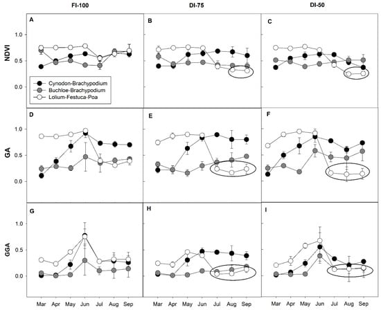 Biomass and vegetation indices of the three mixtures of turfgrass were also examined under both the different water regime conditions and periods of growth. Compared with the standard mixture, the two mixtures with C4 turfgrass evaluated (Cynodon and Buchloe with Brachypodium) were significantly associated with higher biomass at DI-75 and under DI-50 in summer season (Figure 1). The figure also shows that the standard mixture formed only with C3 plants exhibits higher or equal values of biomass, from March to June, compared to the two mixtures of C4-C3 and under the three water regimes assayed. However, during the summer season characterized with high temperatures and lack of rainwater (July, August) the biomass values of the standard mixture were lower than the two other mixtures C4-C3, especially under the two deficit irrigations D-75 and DI-50. Moreover, the two mixtures with C4 species also exhibited significantly higher NDVI, GA, and GGA during the summer period and at DI-75 and DI-50 deficit irrigation (Figure 2).