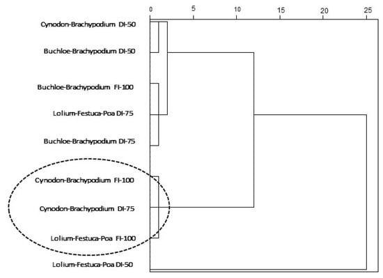Cluster analysis of the three turfgrass mixtures under the different growing conditions assayed and using as variables the shoot biomass and the complete set of vegetation indices studied in this work. Abbreviations of water regime as defined in Figure 3.