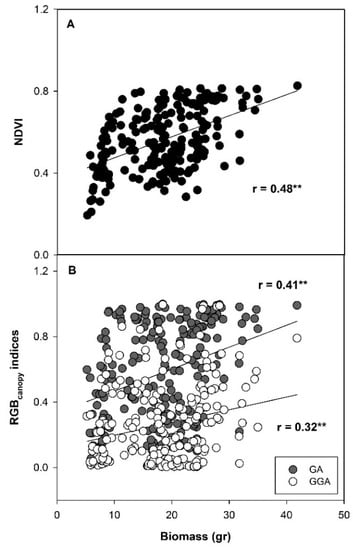 Relationships of Biomass with NDVI, GA and GGA) across all water regimes assayed. Abbreviations of variables as defined in Table 2. Significance levels: **p < 0.01.