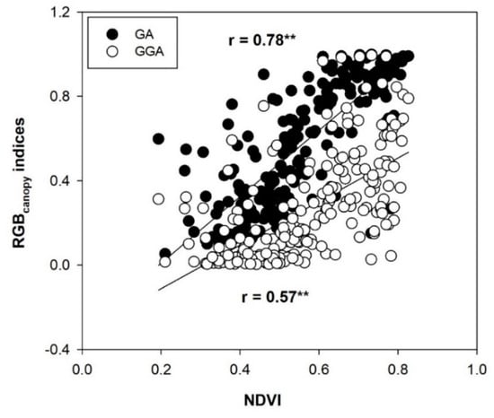 Relationships of NDVI with GA and GGA across all water regimes assayed. Abbreviations of variables as defined in Table 2. Significance levels: **p < 0.01.