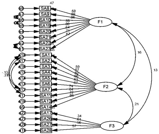 In order to confirm the factor structure of the SAS (as emerged in the EFA) a confirmatory factor analysis was used. The results of the CFA show a good fit to the data with df = 200, Chi square = 768.98, comparative fit index (CFI) = 0.92, tucker-lewis index (TLI) = 0.91, goodness-of-fit index (GFI) = 0.90 and root mean square error of approximation (RMSEA) = 0.05. The criteria followed for determining the best model fit were: CFI > 0.90 [25], TLI > 0.90 [26] GFI > 0.90 [27] and RMSEA < 0.08 [26,27]. Results also show that Chi square/df is 3, representing a good model fit [28].
