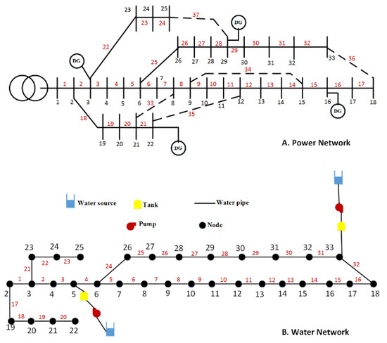 To illustrate the effectiveness of the proposed method, the modified IEEE 33 bus PDN with connected DGs and its related designed WDN as shown in Figure 1 is studied.