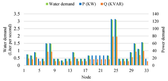 The capacity of each DG is assumed to equal to 150 kW. The active/reactive power peak demands of PDN and water peak demand of WDN are depicted in Figure 2.