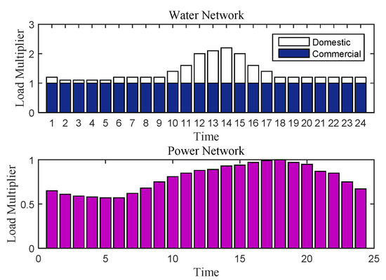 The multipliers of active/reactive power demands show the normalized loads values based on the maximum load, while the hourly multipliers in WDN are denoting the hourly normalized water needs based on the minimum demand in a day. The water demand of commercial loads is considered constant during a day.