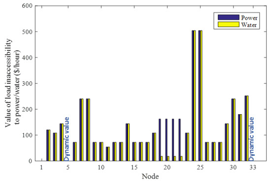 The value of load inaccessibility to power and water is depicted in Figure 4. It is assumed that the loads in nodes (19–22) are commercial, while the rests are residential. Power accessibility is more important than water accessibility for a commercial load. Therefore, according to Figure 4, the inaccessibility value of commercial loads to power is much more than the inaccessibility value to water. Loads in nodes 5 and 33 of the distribution network are water pumps. Thus, the value of load inaccessibility to water of these nodes is zero. It should be noted that the dynamic value of each water pump for restoration will be determined in the restoration problem. In order to determine the importance of one pump, the accessibility function of loads will be obtained with EPANET and will be compared with the state in which the water pump is restored.
