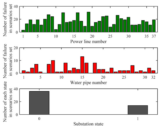 Furthermore, Figure 7 depicts that each component including the power line, water pipe, and substation experience how many failures in the scenarios set.