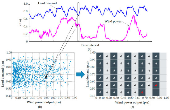 To outline the procedure of the two-step technique, we adopt wind power and load demand as an example. In Figure 1a, the curves present a 10-day snapshot of 15-min wind power and demand data with the values normalized against respective peak values. The discretization process allocates the time-dependent wind power and demand data into a series of bins. For instance, when the width of the bins is set to 0.1 p.u, the data points 0.43 p.u (wind power) and 0.64 p.u (load demand) are allocated into bins (0.40 p.u, 0.50 p.u] and (0.60 p.u, 0.70 p.u], respectively. Then, the aggregation process groups the bins into multiple combinations, e.g., {(0.40 p.u, 0.50 p.u] and (0.60 p.u, 0.70 p.u]}, as shown as the two-dimensional mesh in Figure 1b, using the above processes to sweep all data points and allocate them into corresponding combinations. Since load demand is never below 0.40 p.u, only 52 out of 100 potential combinations have non-zero probabilities of occurrence. These combinations are labeled with “√” in Figure 1c.
