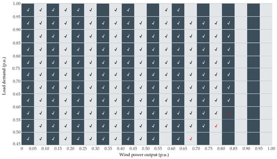 For the first challenge, consider the combinations labeled with the red “√” in Figure 1c, which are characterized by relatively high generation and low demand. If technical constraints are not violated in these combinations, they are unlikely to be violated in other combinations. Therefore, these combinations can represent the worst-case scenarios in determining the hosting capacity, and we define them as extreme combinations. For the second challenge, different bin widths need to be considered. Figure 2 presents the combinations of wind power and load demand when the bin width is set to 0.05 p.u. It is evident that the total number of potential combinations increases significantly compared with the results in Figure 1c, but the number of extreme combinations is almost the same. The adoption of a smaller bin width can generate more compact intervals to be evaluated. Therefore, the selection of bin width may affect the accuracy of hosting capacity assessment, and the quantitative analysis of this impact is presented in Section 4.