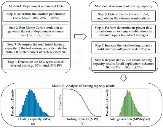 In this section, the computational procedure of the proposed stochastic framework is developed. As shown in Figure 3, the proposed framework has three modules. Module 1 aims to generate various DG deployment schemes. Then, Module 2 conducts the impact analysis to obtain the hosting capacity results of different deployment schemes. Module 3 performs the statistical analysis of the obtained hosting capacity results.