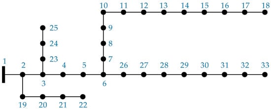 The proposed framework is evaluated on the IEEE 33-bus distribution network, whose single line diagram is presented in Figure 4. We set the voltage of the grid supply point to 1.0 p.u, and the lower and upper bounds of voltage for each bus are 0.95 p.u and 1.05 p.u, respectively. The total peak demand for this test system is 3.715 MW. The detailed parameters and configurations of the test system are available in [36].