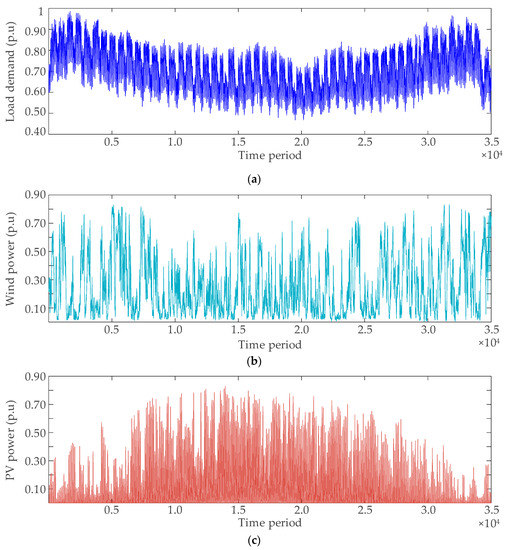 One-year time series data: (a) load demand; (b) wind power; (c) PV power.