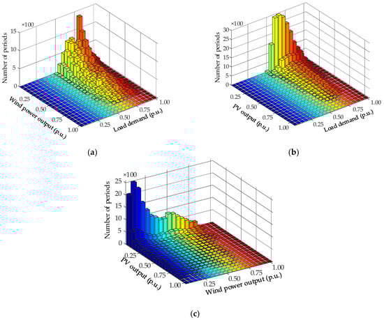 The discretization-aggregation technique in Section 2 is adopted to establish the combinations of renewables and load demands. Figure 6 shows the coincident periods for wind power-load, PV-load, and wind power-PV when the bin width is selected as 0.05 p.u. For the 400 potential combinations of wind power-load, only 175 have non-zero probabilities of occurrence. Similarly, only 133 combinations are non-zero in the PV-load case. For the coincidence of renewable energies, there is a negative correlation between wind power and PV, and the correlation coefficient between two resources is −0.162. The PV output mainly depends on solar irradiation. As a result, solar power is negligible during nighttime. In contrast, wind power during daytime is typically less than at nighttime. The complementarity between wind and solar power has the potential to facilitate energy integration.